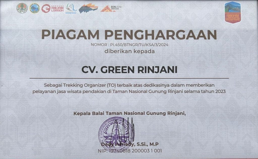Best Local Trekking Organizer by the Rinjani National Park Authority